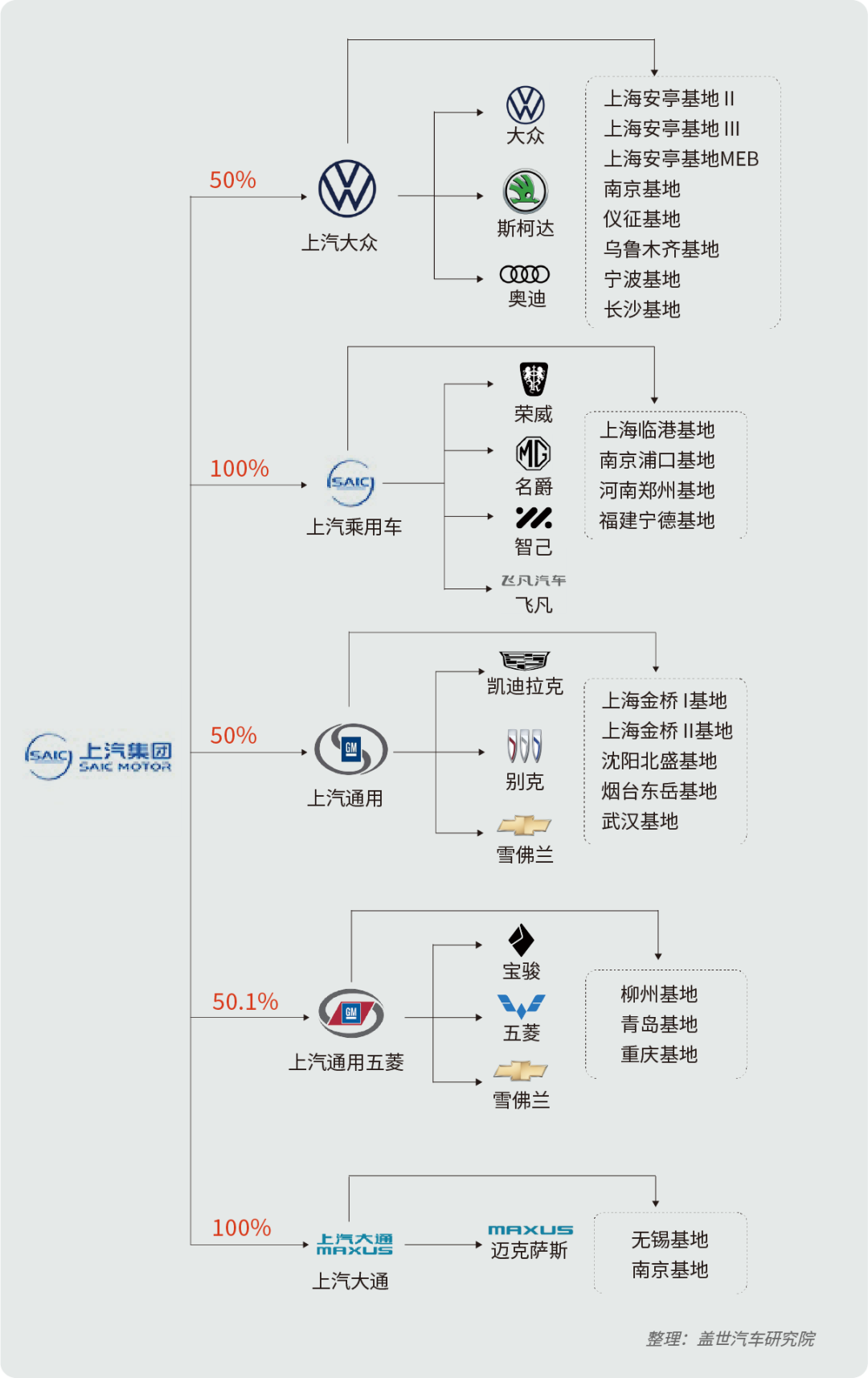 上汽集团作为中国最大的汽车制造商之一,旗下拥有多个知名品牌,包含合资品牌和自主品牌,包括上汽大众、上汽通用以及上汽乘用车等。具体来看,上汽集团拥有上汽大众50%的股份,上汽通用则由上汽集团和通用汽车各持有50%的股份,而上汽乘用车则是上汽集团全资控股。
