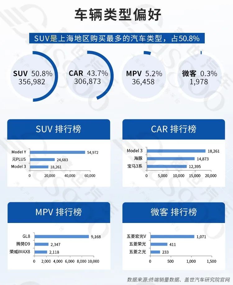 从车辆类型来看,SUV是上海地区购买最多的汽车类型,销量为356982辆,占比50.8%,其次是轿车,销量为306873辆,占比43.7%。
