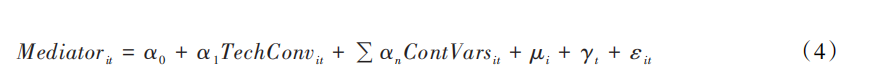 本文采用中介效应检验方法,对前文理论分析部分提出的企业数实产业技术融合影响全要素生产率作用机制进行研究,参考江艇(2022)对因果推断研究中的中介效应分析建议,本文所选取的中介变量对被解释变量全要素生产率的因果关系较为清晰直观,重点关注解释变量(数实产业技术融合)对中介变量的影响。因此,在基准回归模型(1)的基础上,本文设定模型(4)进行中介效应检验: