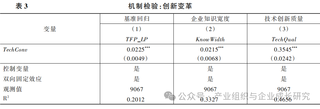 其中,ratioijt表示 IPC 大组分类为 j 的专利占企业当年全部专利的比例,该指数越大,表示企业专利分类差异越大,知识分布越分散,以此衡量企业知识宽度(记为 KnowWidth)。同时,为避免指标测度中专利公开期限造成的偏误(寇宗来和刘学悦,2020),在回归时剔除年份为 2018 年和 2019年的样本,中介效应检验结果见表 3 第(2)列。解释变量 TechConv 对中介变量 KnowWidth 的回归系数显著为正,表明企业数实产业技术融合对企业知识宽度具有显著的正向影响,即企业进行数实产业技术融合能够拓宽企业知识宽度,从而提升企业全要素生产率。