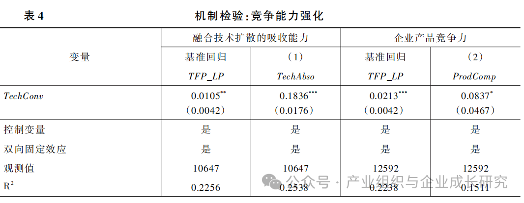 假说 2:企业进行数实产业技术融合能够强化企业对融合技术扩散的吸收能力,提升企业产品竞争力,从而提升企业全要素生产率。