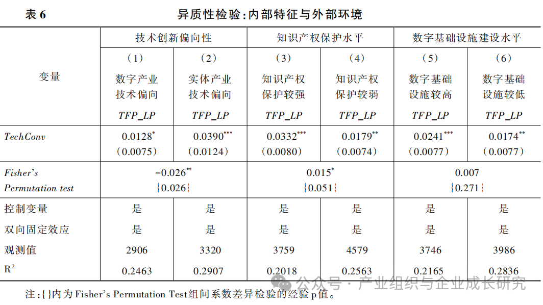 知识产权保护有助于推动企业发明专利的转化与应用,保障企业技术创新的收益能力。本文参考黄勃等(2023)对地区知识产权保护水平分类方法,以中国各省份知识产权保护发展指数作为地区当年知识产权保护水平的测度指标,利用各年度知识产权保护发展指数的三分位数将样本分为知识产权保护较强、居中、较弱等三组样本,选取其中知识产权保护较强与较弱两组作为异质性检验样本,数据来源于国家知识产权局发布的各年度《全国知识产权发展状况报告》。异质性分析结果见表6 第(3)、(4)列,结果显示,不同知识产权保护水平的样本中,解释变量 TechConv 的回归系数均显著为正,同时企业数实产业技术融合的系数在知识产权保护较强一组中相对更大,Fisher’s Permutation Test 组间系数观测差值在 10% 水平上显著,即组间系数存在显著差异,表明更高的知识产权保护水平有助于增强数实产业技术融合对企业全要素生产率的提升作用。