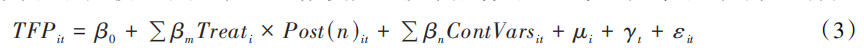 由于企业的技术创新行为具有连续性,因此,不同企业在不同时点开始数实产业技术融合的创新行为决策可以视为一项准自然实验。本文参考吴非等(2021)的研究,利用多时点双重差分模型(DID)对内生性问题进行控制,并进一步利用动态效应分析研究全要素生产率的动态趋势特征。