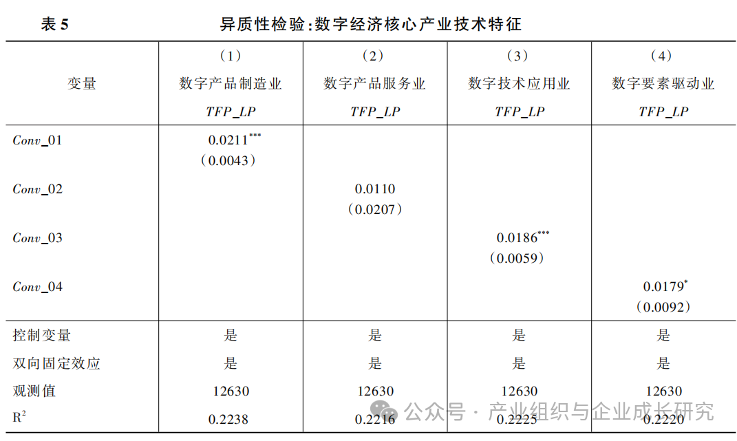 《数字经济及其核心产业统计分类(2021)》中将数字经济核心产业分为 01 数字产品制造业、02 数字产品服务业、03 数字技术应用业和 04 数字要素驱动业四大类,不同分类下数字经济产业技术对实体经济的赋能特征与效率可能存在差异,从而对企业全要素生产率提升作用存在异质性。本文在基准回归的识别基础上,进一步识别各项发明专利所属的数字经济产业分类,若一项实体产业技术所引用的专利 IPC 分类从属于一类数字经济产业大类,则认为该项专利为涉及此数字经济产业大类的一次数实产业技术融合。将识别结果在企业—年份层面汇总,得到企业涉及数字经济产业各分类的数实产业技术融合次数,加 1 取自然对数后作为解释变量(Conv_01—Conv_04)进行异质性检验。