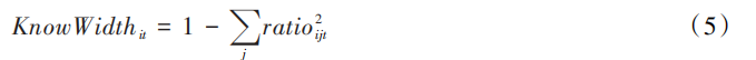 本文理论分析指出,企业数实产业技术融合能够提升企业知识扩散范围与效率,降低知识搜寻与获取成本,从而拓展企业知识宽度,以此促进企业全要素生产率的提升。本文参考张杰和郑文平(2018)对专利知识宽度的测度方法,计算企业知识宽度,以测度企业技术创新中所包含知识的复杂程度。本文利用发明专利申请时的 IPC 主分类号,在大组层面设定式(5),计算企业专利分类的赫芬达尔—赫希曼指数(HHI):