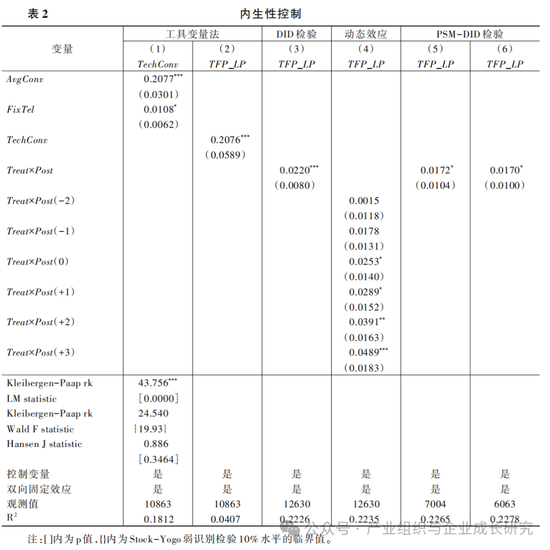 本文借鉴已有文献,利用同一年度、同一规模其他企业平均水平(尹志锋等,2023)与 1984 年各城市每万人平均固定电话数量(黄群慧等,2019)构建工具变量,从而缓解实证分析中内生性问题的干扰。具体而言,首先在各年度内将总资产作为企业规模的分类依据,按照企业规模的十分位数将所有企业分组,并计算同一分组内除企业自身外其他企业的数实产业技术融合平均水平作为工具变量(记为 AvgConv),在分组层面的汇总有助于缓解企业层面存在的内生性带来的反向因果问题,其他企业数实产业技术融合平均水平一定程度上可以反映企业个体的差异,同时又可避免企业自身特征对工具变量排他性的干扰。并且基于企业规模的分组计算,在控制企业固定效应以及企业规模控制变量后,能够较好地排除企业规模特征对数实产业技术融合与全要素生产率的潜在影响,因此,该工具变量能较好满足相关性与排他性要求。并且,历史上固定电话普及率可能影响当地互联网的普及与发展,因此,可能与企业进行数实产业技术融合的所需数 字 基 础 设 施 支 撑 存 在 相 关 性 ,而 固 定 电 话 对 企 业 全 要 素 生 产 率 的 影 响 逐 渐 消 失(黄 群 慧 等 ,2019)。同时,考虑到固定效应模型的检验中使用单一年度的变量会出现无法度量的问题,参考Nunn and Qian(2014)将 1984 年城市层面每万人平均固定电话数量与城市层面互联网接入数的交互项作为企业数实产业技术融合的工具变量(记为 FixTel),能一定程度上满足相关性与排他性要求。