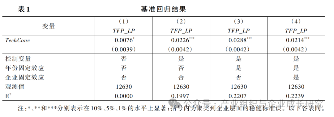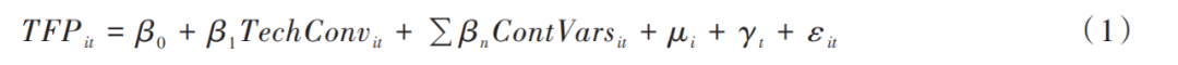 其中,下标 i、t 分别表示企业、年份,TFPit为企业 i 在 t 年的全要素生产率。TechConvit为企业 i 在t 年的数实产业技术融合数量,ContVarsit为一系列控制变量构成的集合,μi为企业固定效应,γt为年份固定效应。其中,β1为本文所关注变量的回归系数,若系数 β1显著为正,则可以推断企业的数实产业技术融合行为能够提升企业的全要素生产率,支持本文理论的预期。