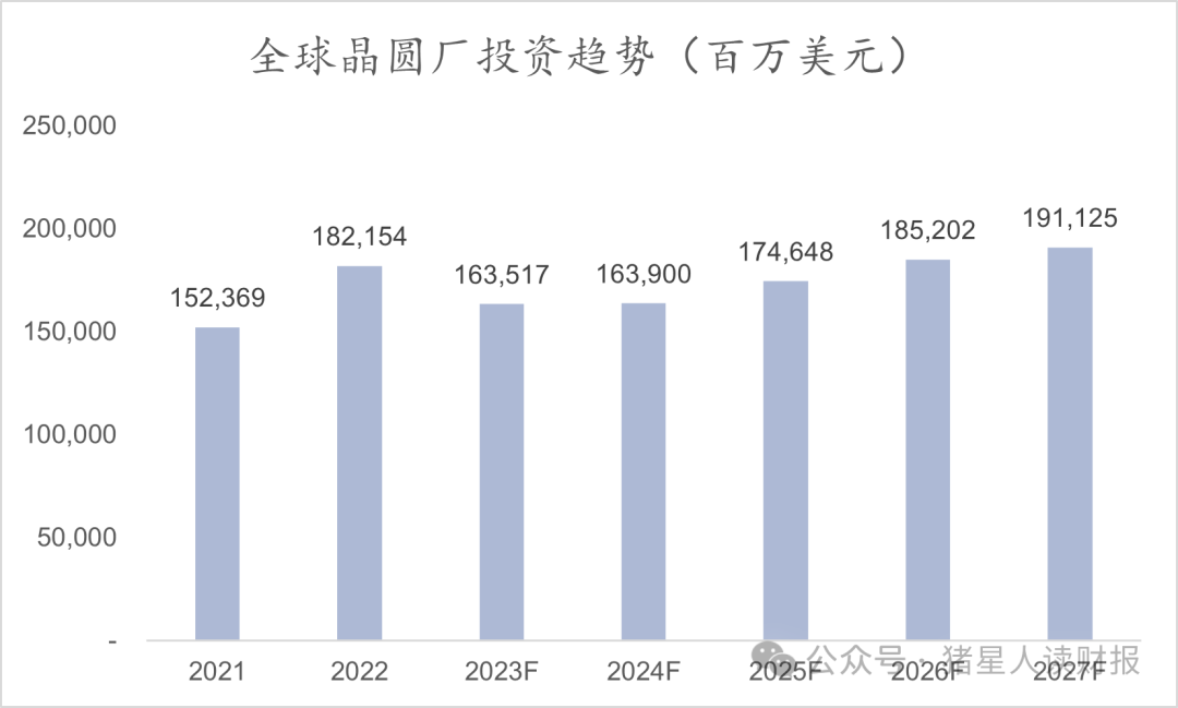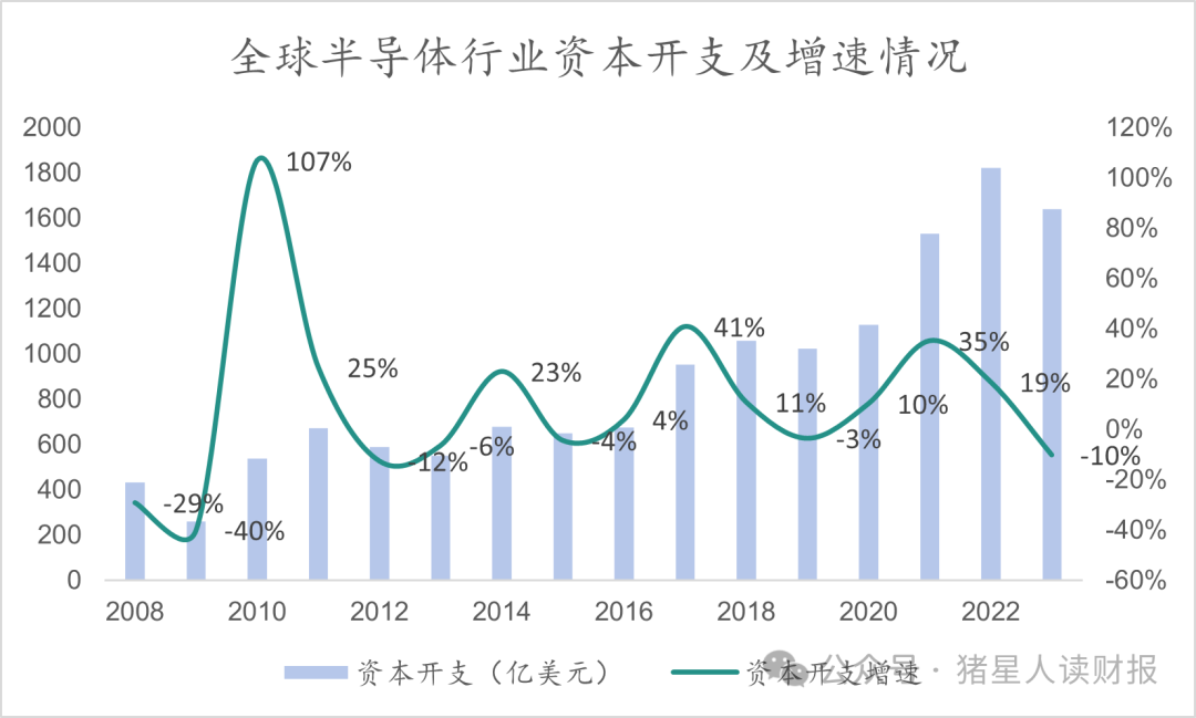 在过去的几十年里,每一个新的资本开支高峰都是被单一的新产品、新技术推动,比如在1984年资本开支增速达88%,是PC机产品的带动资本投入;2000年资本开支增速达85%,是全球网络服务器需求量大增的原因;2010年资本开支增速达107%(图1),是智能手机的问世;近些年的增速或者说波动率有所降低,主要系数码产品已经渗透到政府、工业、经济以及老百姓生活的各个层面,驱动力不再是单一产品,现在是大数据、无人驾驶汽车、AI大模型等新技术的合力驱动资本加大对半导体行业的投入。但是,于2023年,半导体行业资本开支进入低潮,业内人士普遍认为在2024年下半年会恢复一定的水平,2026年-2027年是上升趋势。