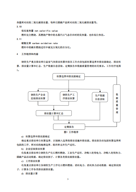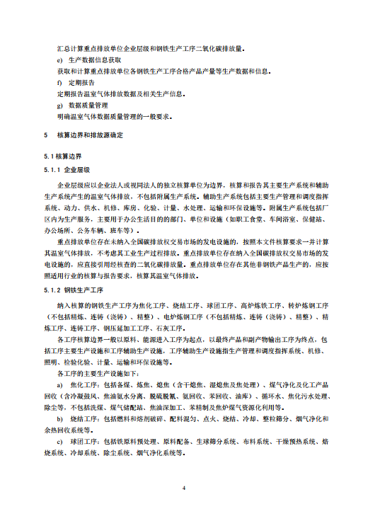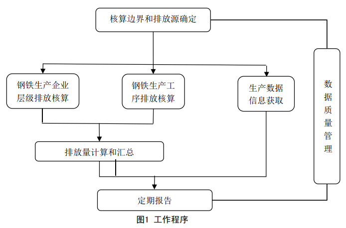 钢铁生产重点排放单位温室气体排放核算和报告工作内容包括核算边界和排放源确定、 排放核算、 排放量计算和汇总、 生产数据信息获取、 定期报告和数据质量管理的相关要求。