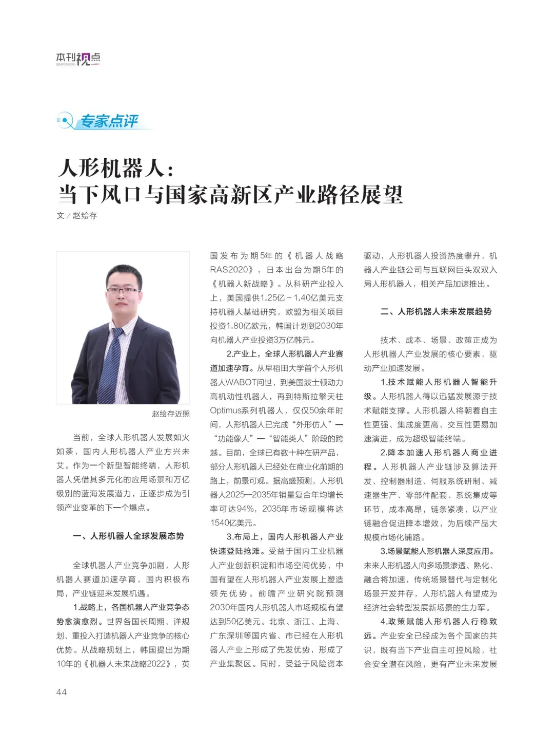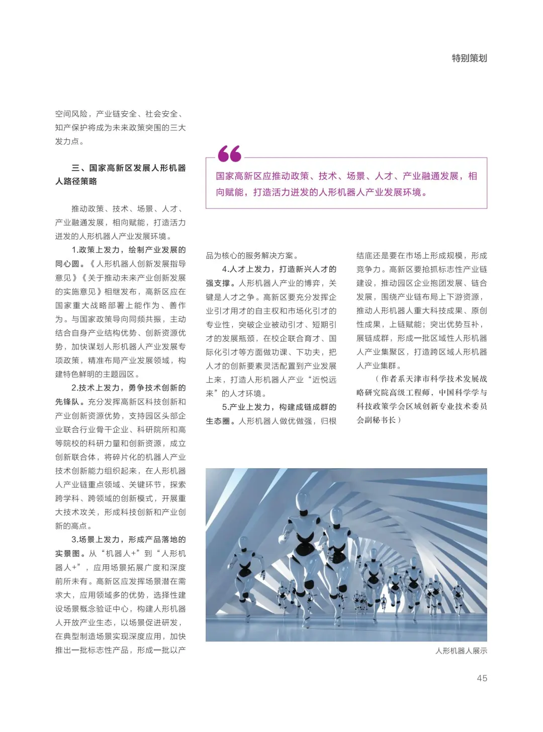 4.人才上发力,打造新兴人才的强支撑。人形机器人产业的博弈,关键是人才之争。高新区要充分发挥企业引才用才的自主权和市场化引才的专业性,突破企业被动引才、短期引才的发展瓶颈,在校企联合育才、国际化引才等方面做功课、下功夫,把人才的创新要素灵活配置到产业发展上来,打造人形机器人产业“近悦远来”的人才环境。