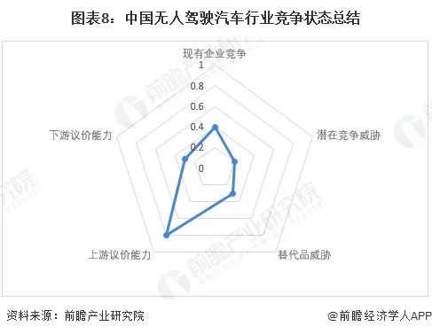 从五力模型的角度进行分析,我国无人驾驶汽车行业属于新兴行业,行业内企业主要集中在科技公司、汽车整车厂商和初创企业,且企业都具备独特优势,现有企业竞争一般;无人驾驶汽车作为未来汽车产业的重要发展方向,目前尚不存在替代品,但由于无人驾驶汽车离市场全面推广还有一定距离,产品还有待市场检验,因而传统的智能型汽车(装备ADAS驾驶辅助系统)仍将是未来几年汽车产业发展的主流,综合来看,替代品威胁相对适中,无人驾驶汽车遭到全面取代的可能性极低;国内无人驾驶汽车行业整体技术水平落后国外先进企业,部分关键零配件被少数国外企业控制,国内市场依赖进口,从而导致上游关键零配件行业对国内无人驾驶汽车行业具备较强的议价能力;无人驾驶汽车属于未来市场产品,短期内具有一定的稀缺性,因而在无人驾驶汽车还未成为市场主流的情况下,行业下游议价能力较低;新进入者方面,无人驾驶汽车行业进入成本和门槛较高,且行业目前市场规模较小,一般新进入者在行业不成熟时,多采取合作的方式,总体而言潜在进入者的威胁较小。