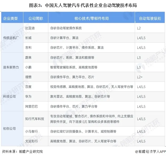 从竞争派系来看,我国无人驾驶汽车企业大致可分为互联网/高科技公司、整车制造厂商和初创公司三大阵营。在无人驾驶汽车的研发上,高科技公司都表现出了巨大的参与热情,并且形成了第一阵营,国内主要有百度、滴滴等积极参与智能汽车的项目运作;第二阵营则为整车企业,比如国内的广汽、吉利、比亚迪、长安等;第三阵营为AutoX、小马智行、文远知行等初创公司。