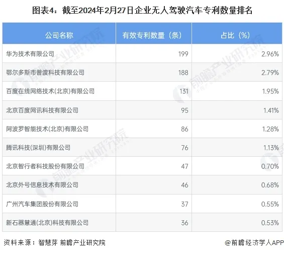 从专利数量来看,根据智慧芽的数据,截至2024年2月27日,无人驾驶汽车行业有效专利数共6729条,其中,百度、华为、普渡科技拥有的有效专利数最多,分别为312、199、188条,三者专利数合计占比10.39%。