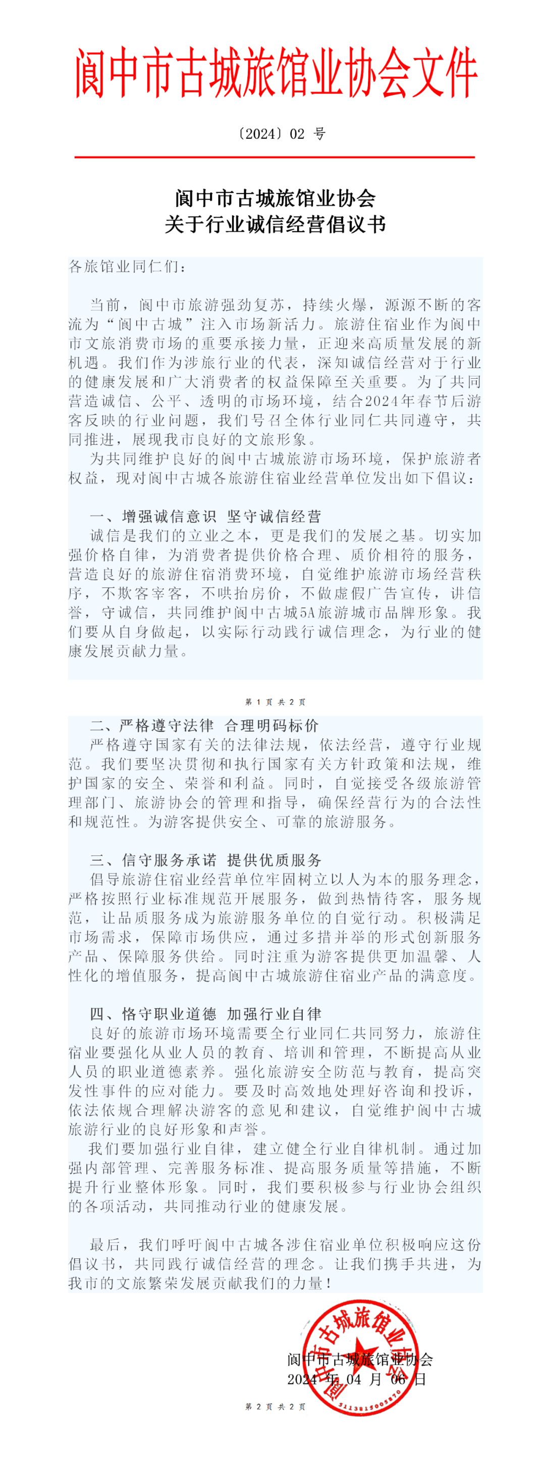 阆中市古城旅馆业协会关于行业诚信经营倡议书