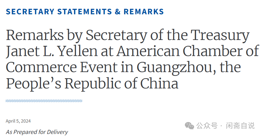 前言:2024年4月5日,到访广州的美国财政部长在美国商会活动中就中美经济关系发表演讲。译文仅供交流。