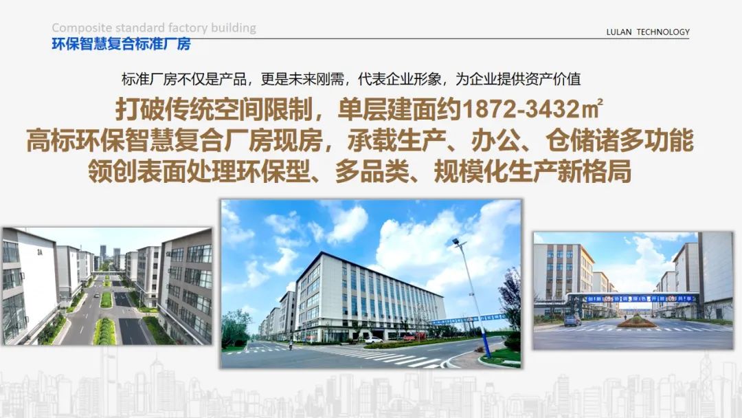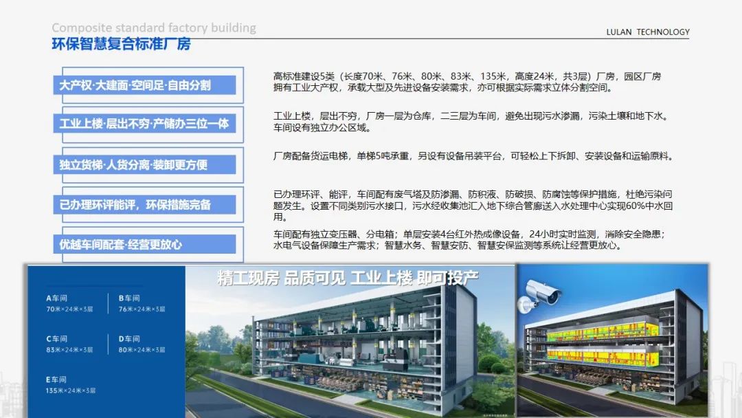 高标准建设5类(长度70m、76m、80m、83m、135m,高度24m,共3层)厂房,园区厂房拥有工业大产权,承载大型及先进设备安装需求,亦可根据实际需求立体分割空间。