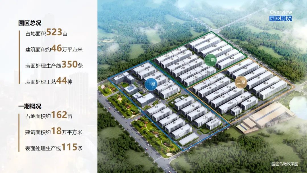 项目规划总投资25亿元,分三期建设,规划占地523亩,建筑面积约47万㎡,规划建设50栋厂房、350条智能化表面处理生产线,涉及军工、航空航天、高铁、重工、光电、IT电子等高精尖制造及五金制造配套表面处理工艺44种,涵盖铝型材阳极氧化、镀锌(酸锌/碱锌/锌镍合金)、镀铜/镍/铬/锡/金/银、电解/抛光/磷化/电泳/发黑等表面处理工艺。项目全面建成投产后,可实现年产值约60亿元,利税约3亿元。目前,项目一期大境已成,二期开发中。