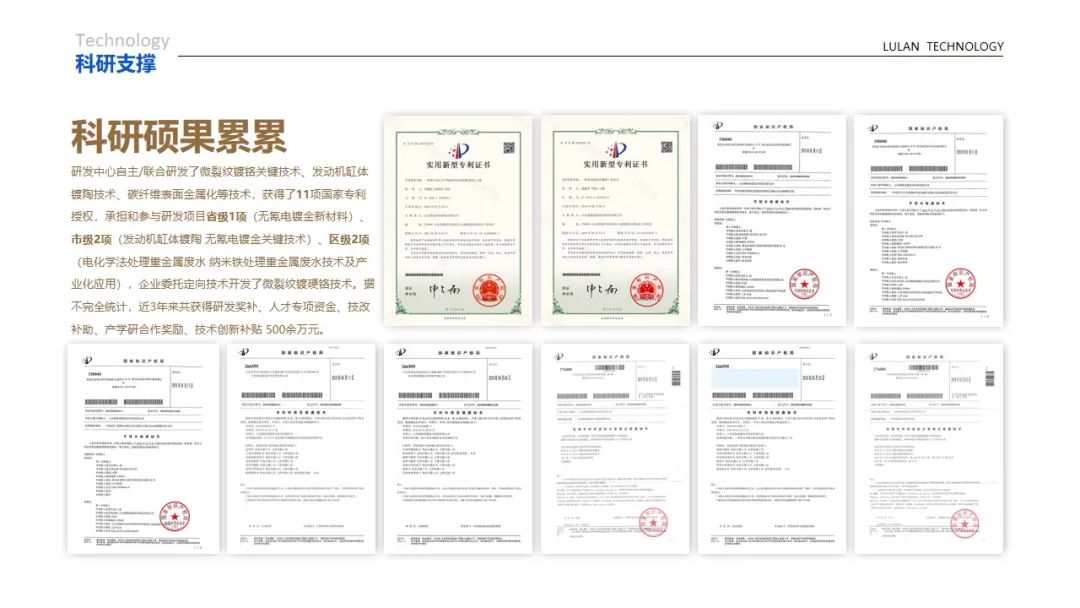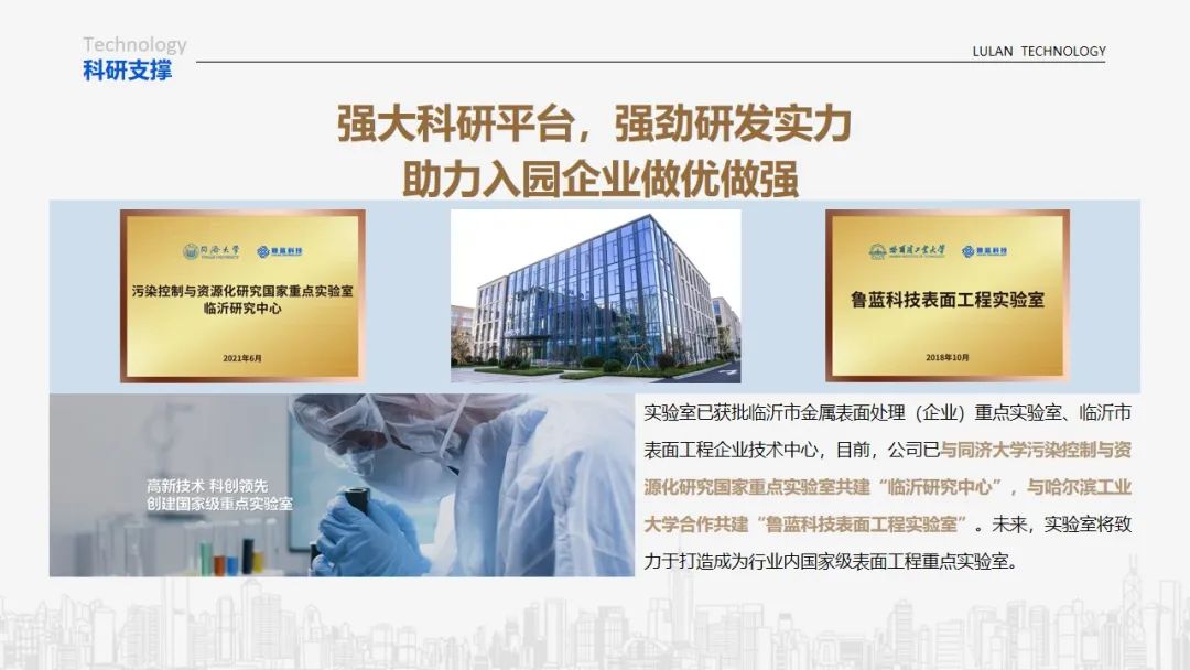 科研支撑方面,与同济大学污染控制与资源化研究国家重点实验室共建“临沂研究中心”,与哈尔滨工业大学合作共建“鲁蓝科技表面工程实验室”,多年来为诸多国内制造名企提供了关键零部件、关键元器件、配套产品和配套服务,承担了多项国家及省、市级重点研项目。实验室同时为入园企业提供工艺改进、产品提升等定制化解决方案和全方位技术支持。