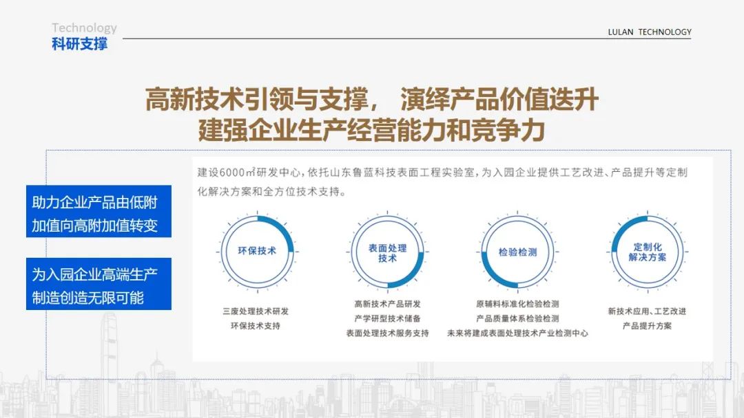 鲁蓝科技园区作为带动临沂市及沂河新区五金产业转型升级的重大科技创新引领项目,在表面处理加工、新镀种研发、表面废水处理等方面具有行业领先优势,并深谙各类表面处理环保问题和技术难题的破解。