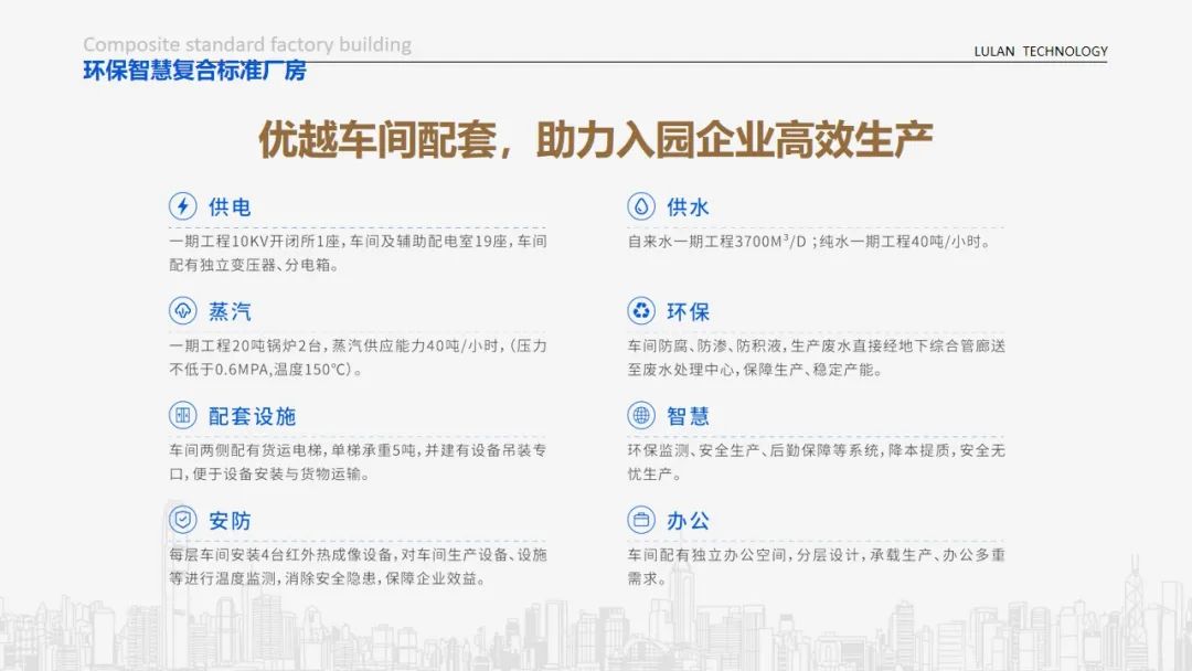 车间配有独立变压器、分电箱;单层安装4台红外热成像设备,24小时实时监测,消除安全隐患;水电气设备保障生产需求;智慧水务、智慧安防、智慧安保监测等系统让经营更放心。