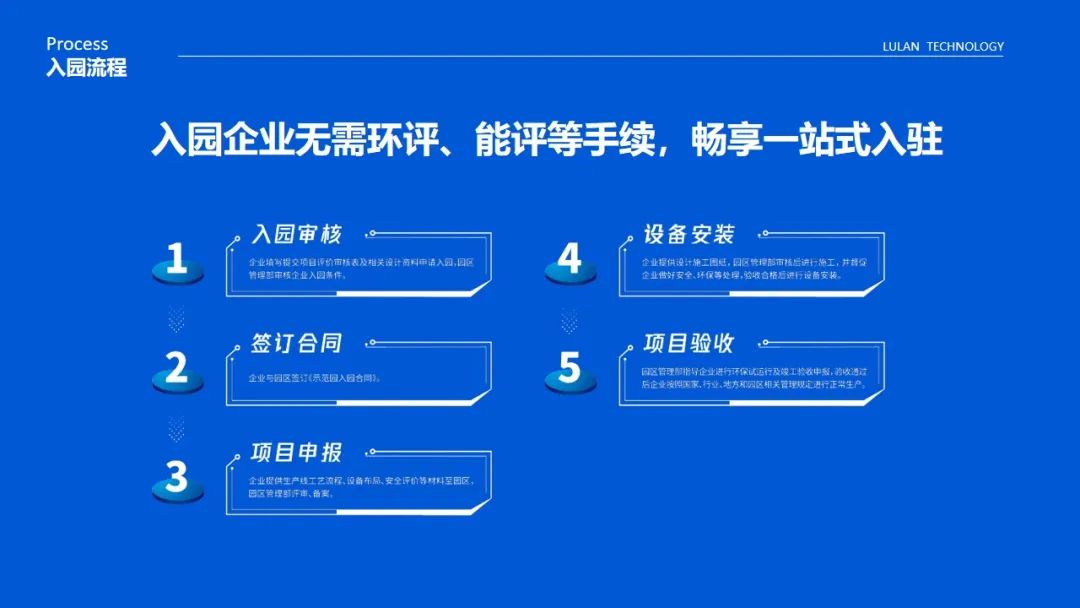 入园流程:入园企业无需环评、能评等手续,畅享一站式入驻。
