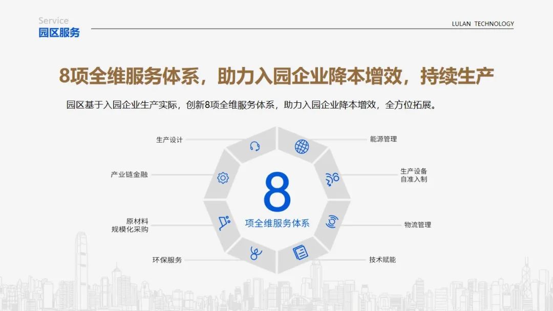 同时基于入园企业生产实际,创新8项全维服务体系,助力入园企业降本增效,全方位拓展。