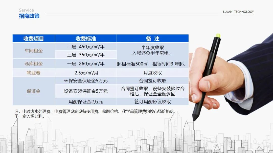 招商政策概述:厂房面向电镀、喷涂等表面处理企业,可租可售,350元/㎡起租,部分260元/㎡。起租标准500㎡,租赁时间3年起。所有入园企业根据项目情况给予2—6个月免租设备安装期。废水处理费、电费管理设施设备使用费、盐酸价格、化学品管理费均按市场价格给予一定入场让利。详情请咨询:0539-8828 555