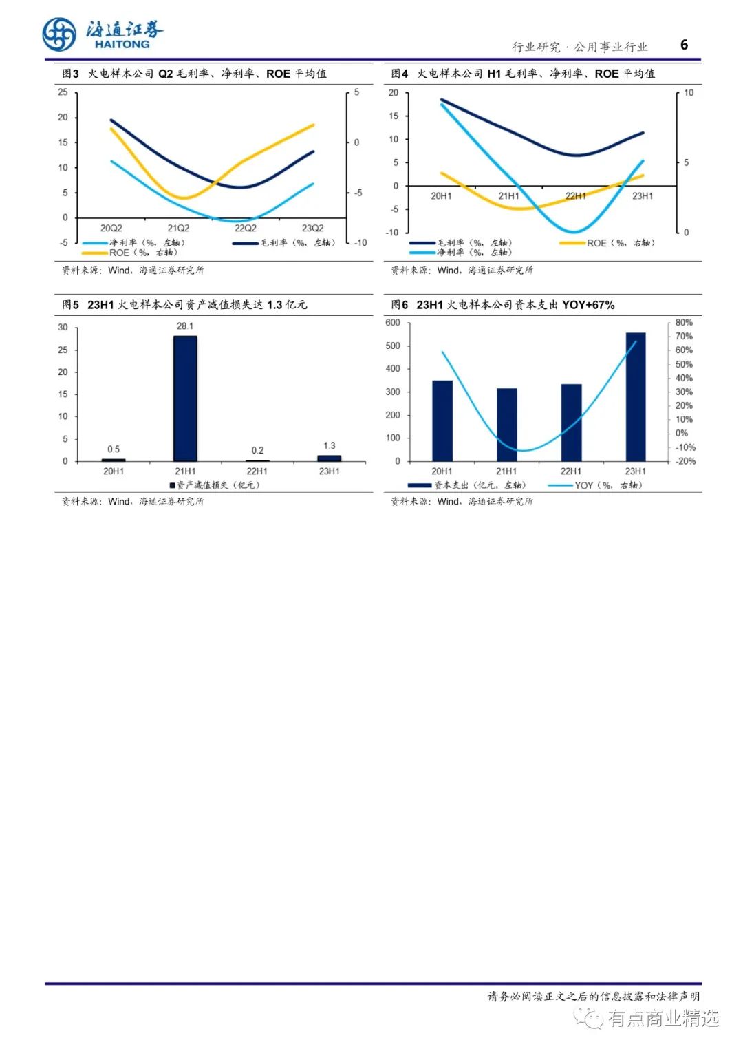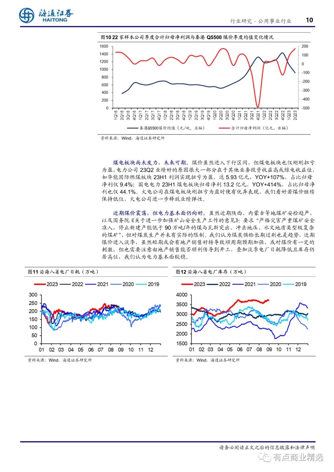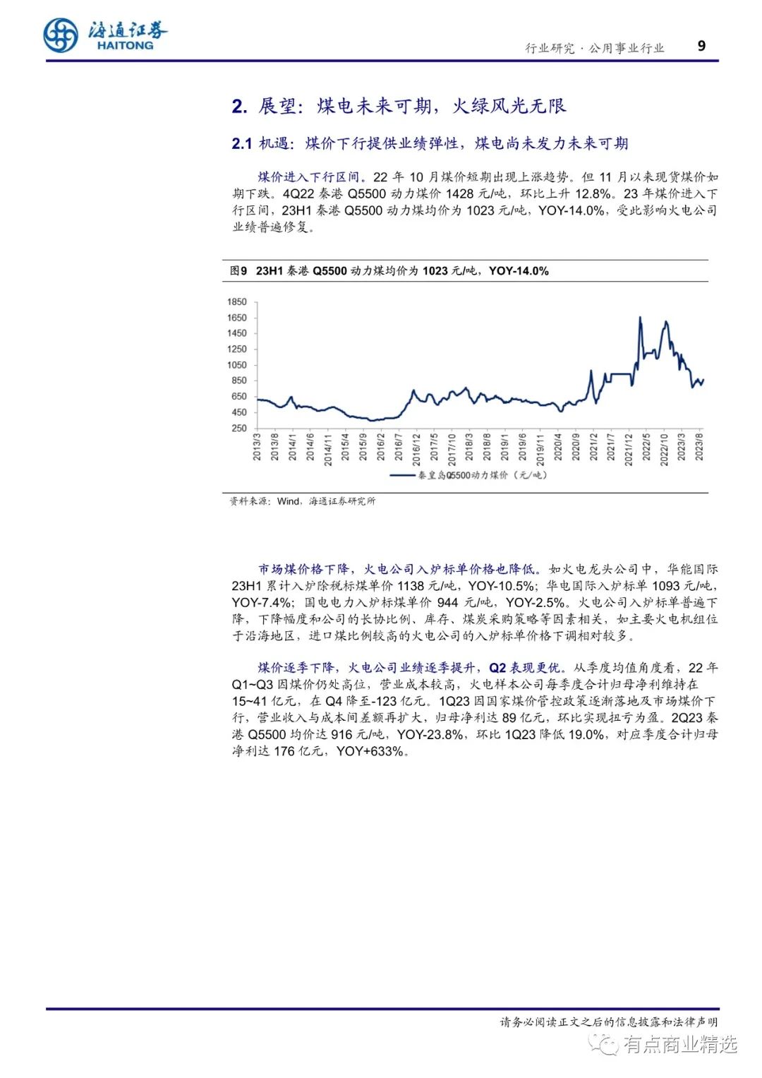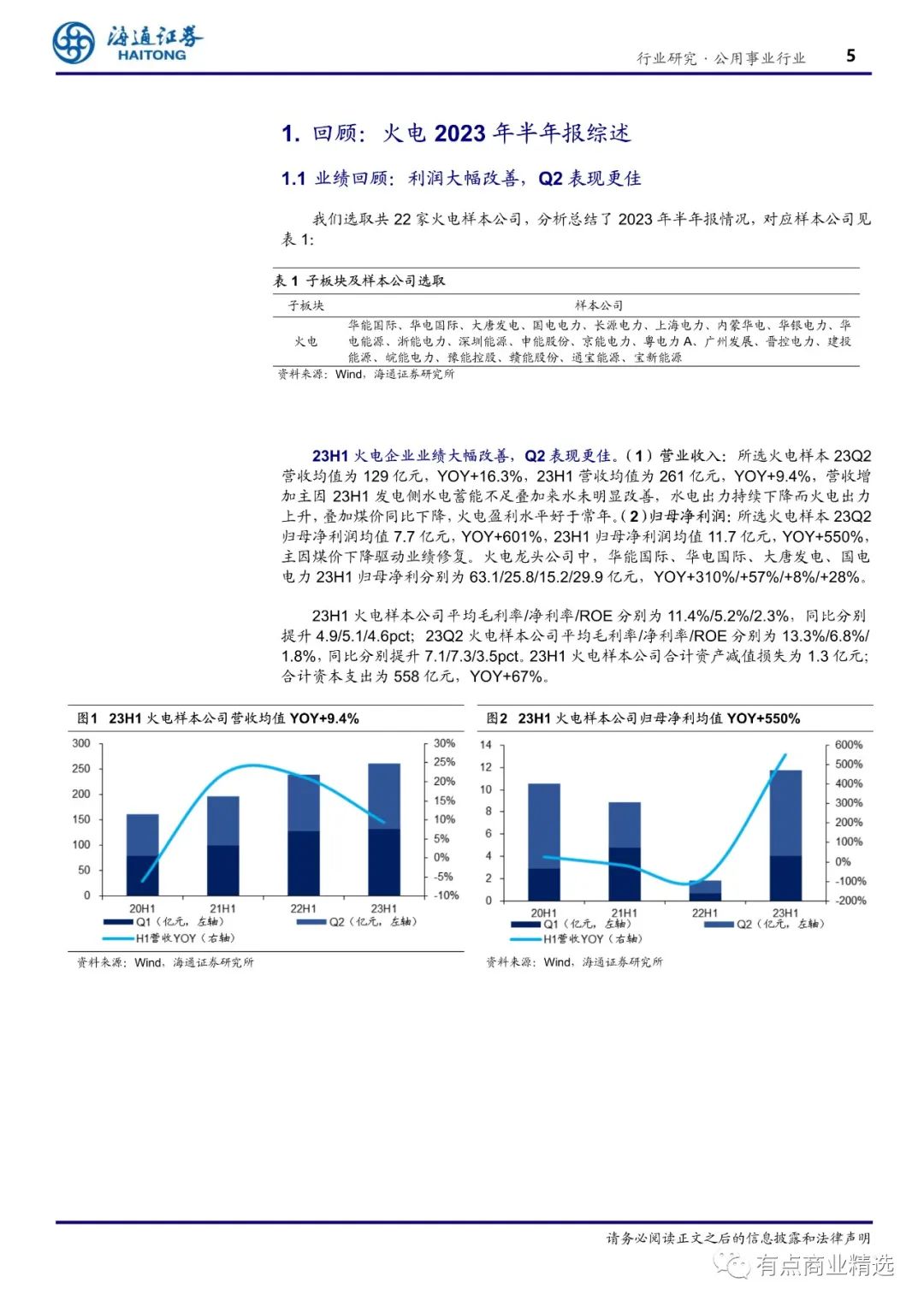 上半年火电业绩逐季改善,电力业务量价齐升。(1)业绩:23H1 火电样本公司的平均营业收入为 261 亿元,YOY+9%,平均归母净利为 11.7 亿元,YOY+550%;其中 2Q23 火电样本公司的平均营业收入为 129 亿元,YOY+16%,平均归母净利为 7.7 亿元,YOY+601%。