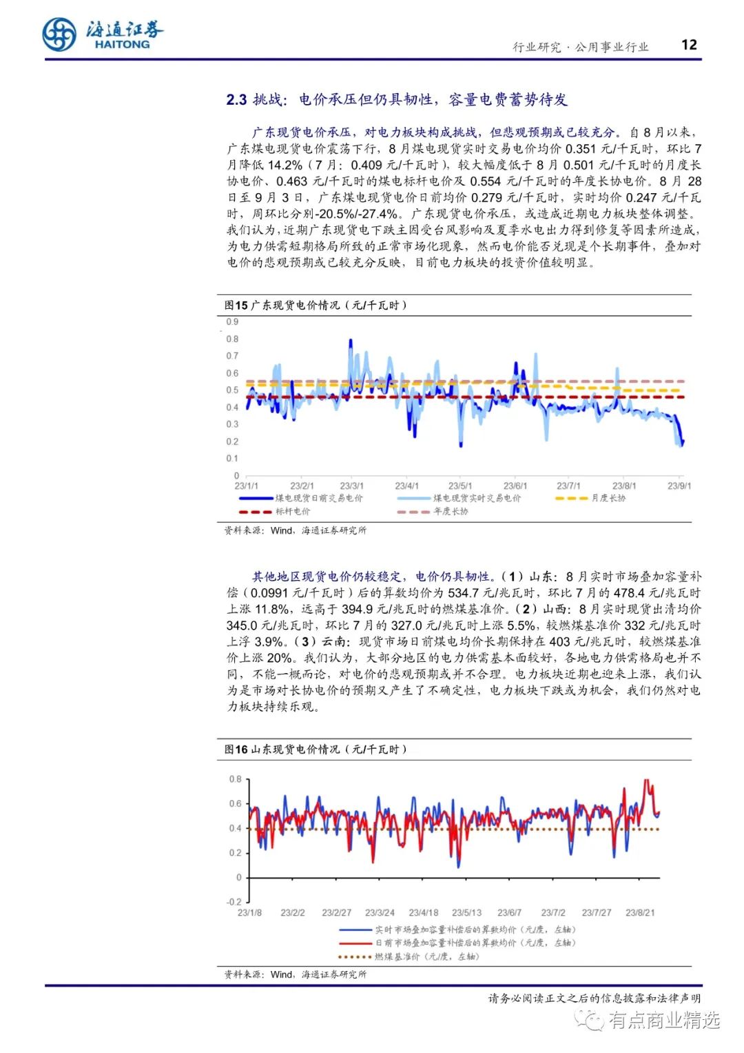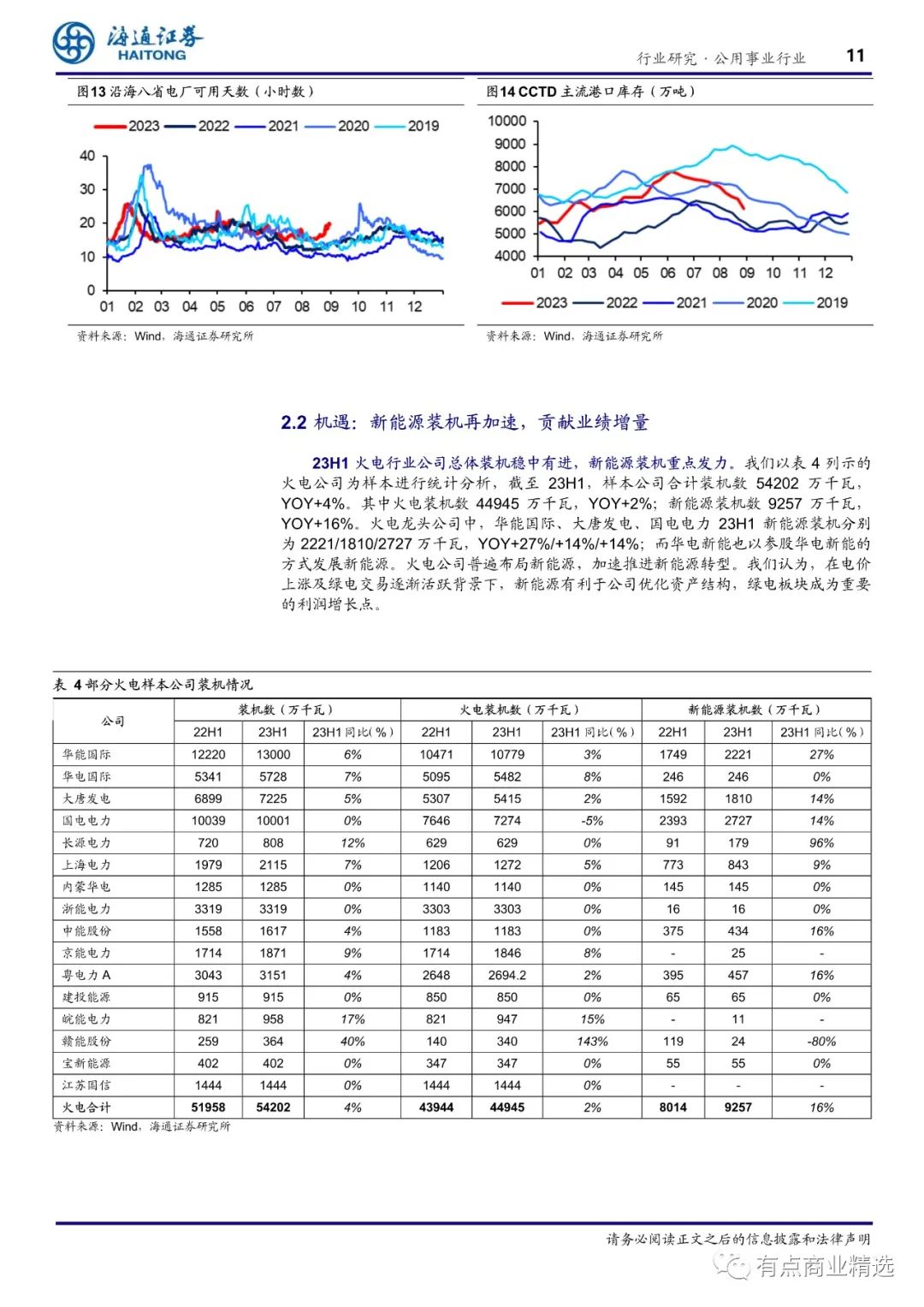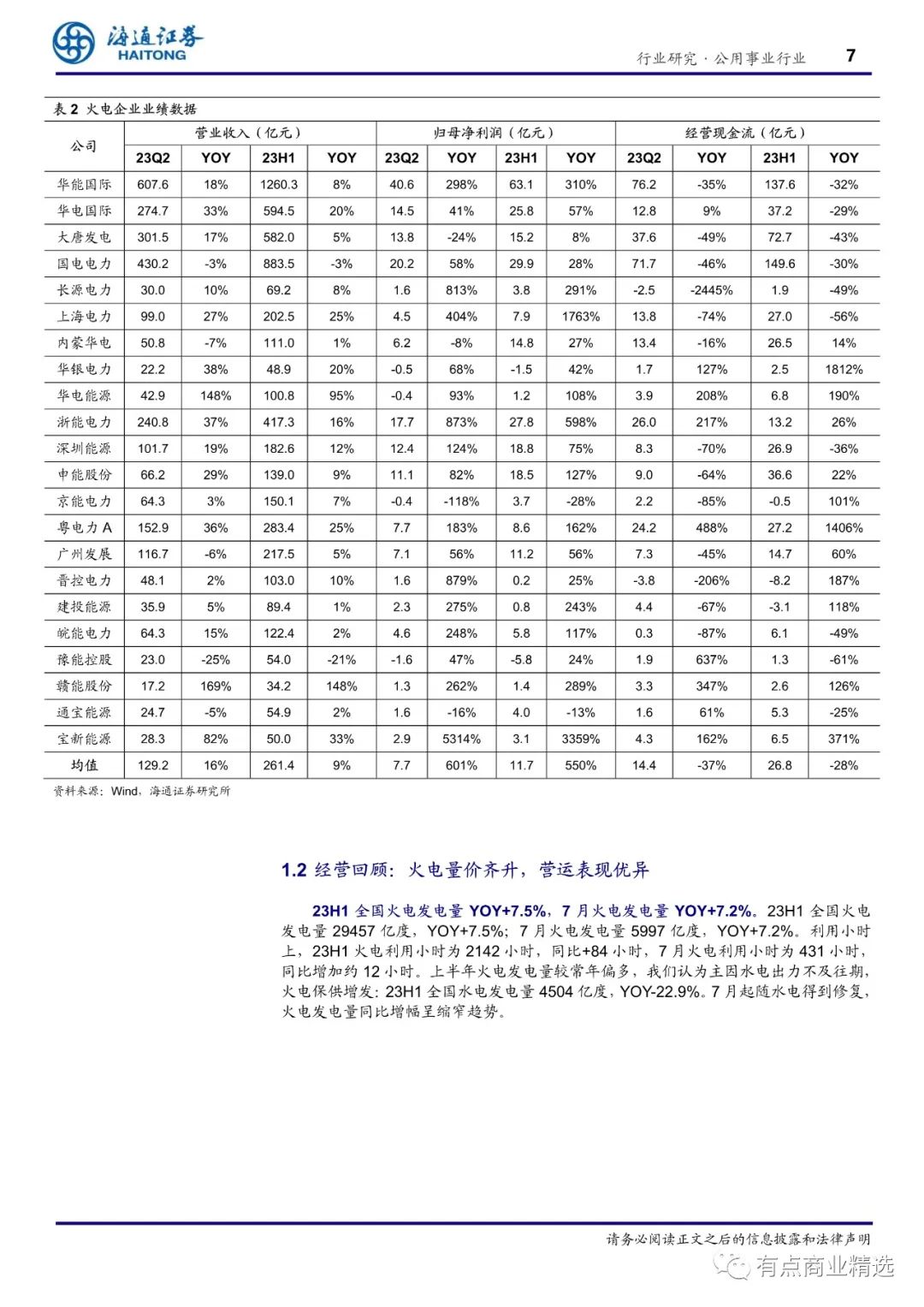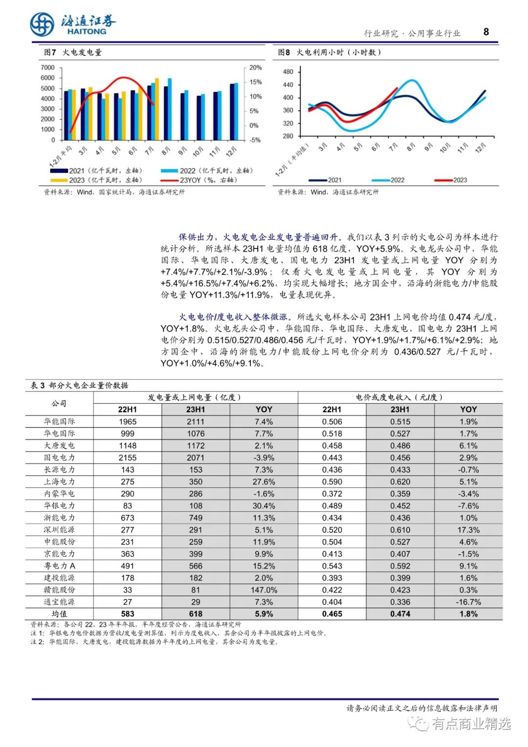 (2)经营:23H1 全国火电发电量 YOY+7.5%,7月火电发电量 YOY+7.2%。我们所选部分样本火电公司 23H1 电量均值为 618 亿度,YOY+5.9%;23H1 上网电价均值 0.474 元/度,YOY+1.8%。