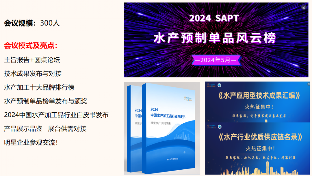 “水产品加工技术研讨会(SAPT)”,已连续举办四届,参与人数累计1500左右。形成了每年一届的水产综合方向的水产行业品牌活动,结合平行论坛、产品品鉴、品牌评奖、读物发布、成果展示等形式持续创新,不断扩大活动规模和行业影响力。