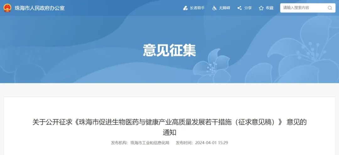 近日,珠海市工业和信息化局就《珠海市促进生物医药与健康产业高质量发展若干措施(征求意见稿)》(以下简称《征求意见稿》)公开征求意见。