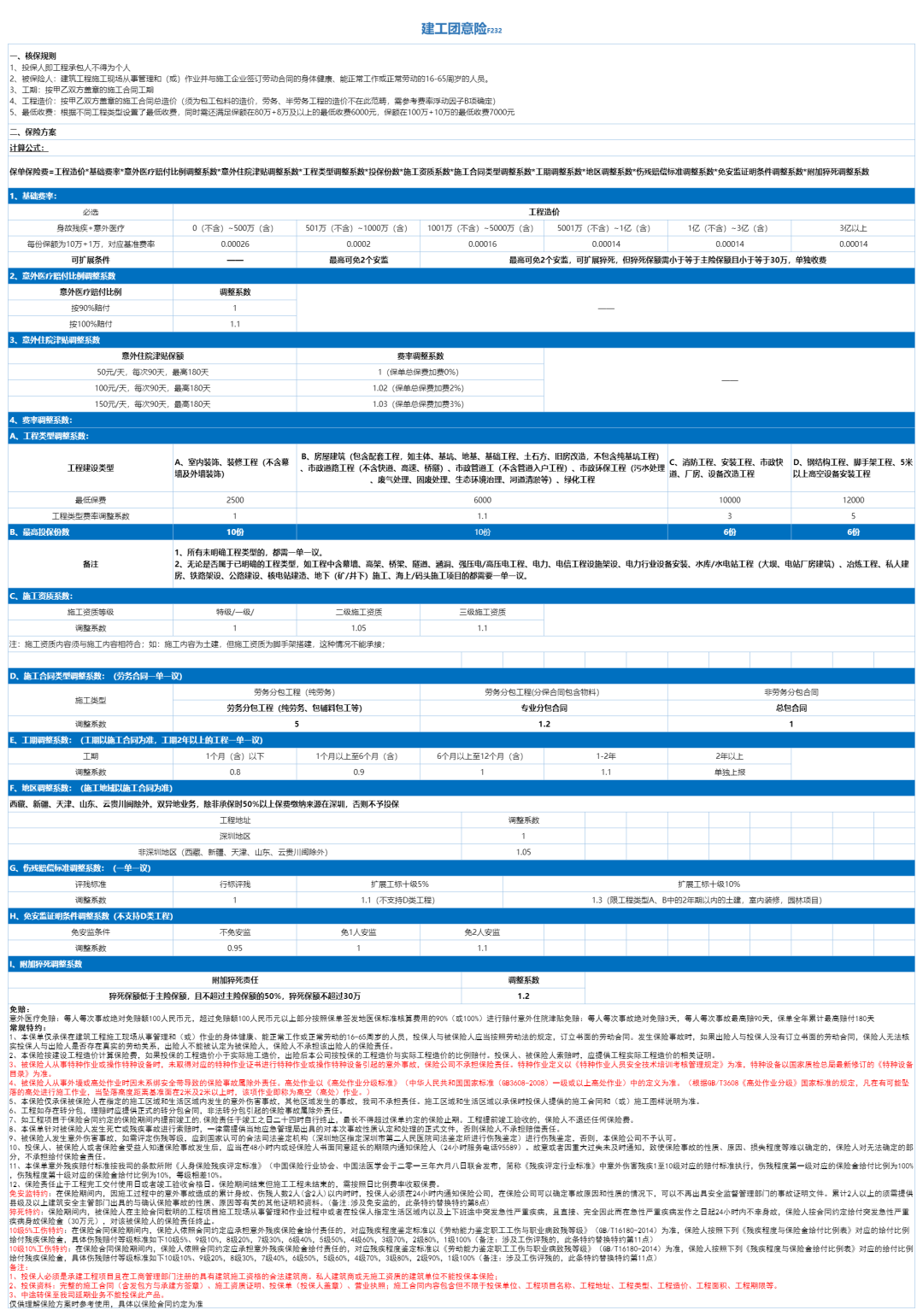 F232款:高危行业建工团意-专属方案,多计划可选,最高100+10,可拓展工标5%或10%,可扩展猝死责任,可选免安监,免高空证,适用于各类总包分包工程,室内外装修,设备安装改造类,房建类工程。(钢结构、幕墙、修路、修桥难度高的也可,请自带需求)。