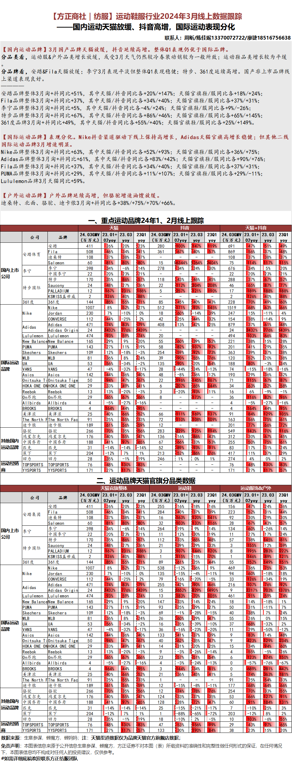 附:【方正商社| 纺服】运动鞋服行业2024年3月线上数据跟踪