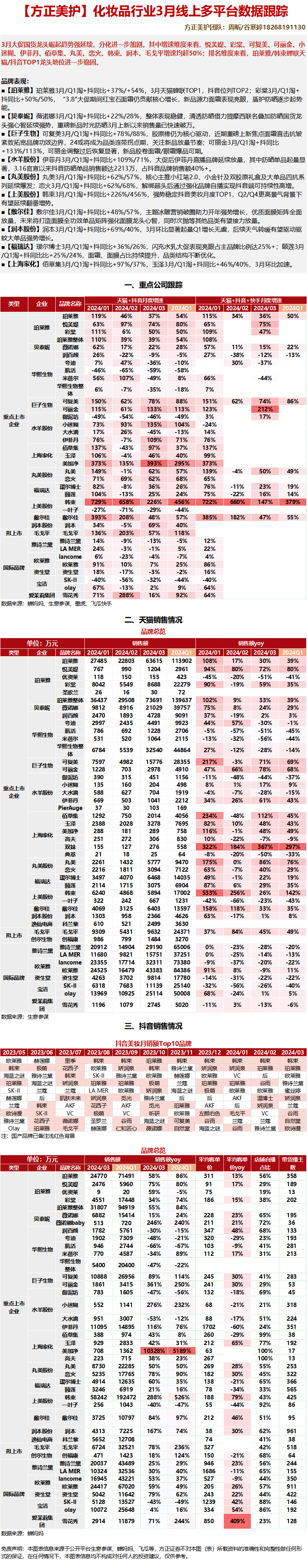 (1)3月化妆品线上大盘受大促驱动,国货龙头崛起趋势延续,分化进一步加剧,多国货龙头3月双渠道增速超50%,Q1增长无虞,珀莱雅/韩束分别蝉联天猫/抖音TOP1,龙头地位进一步稳固。