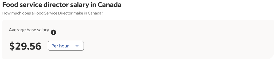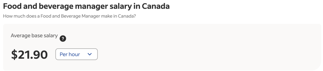 根据indeed的薪酬调查数据显示,餐饮经理在加拿大的平均时薪为CAD$21.90,而餐饮服务部主任的平均时薪则为CAD$29.56。