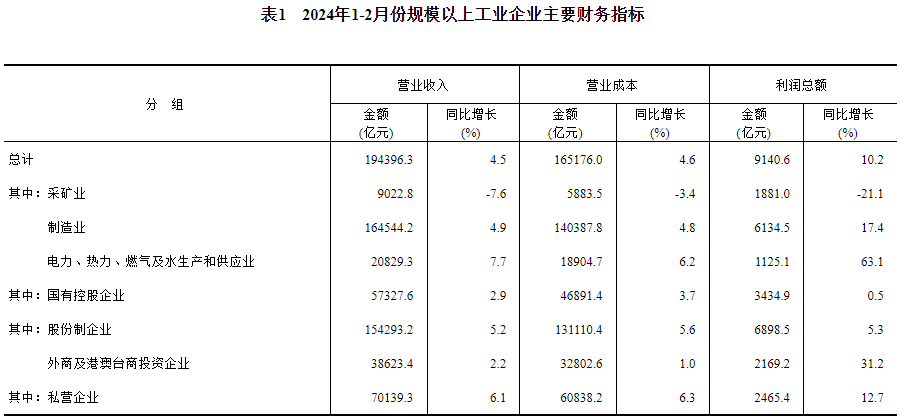1—2月份,全国规模以上工业企业实现利润总额9140.6亿元,同比增长10.2%(按可比口径计算,详见附注二)。