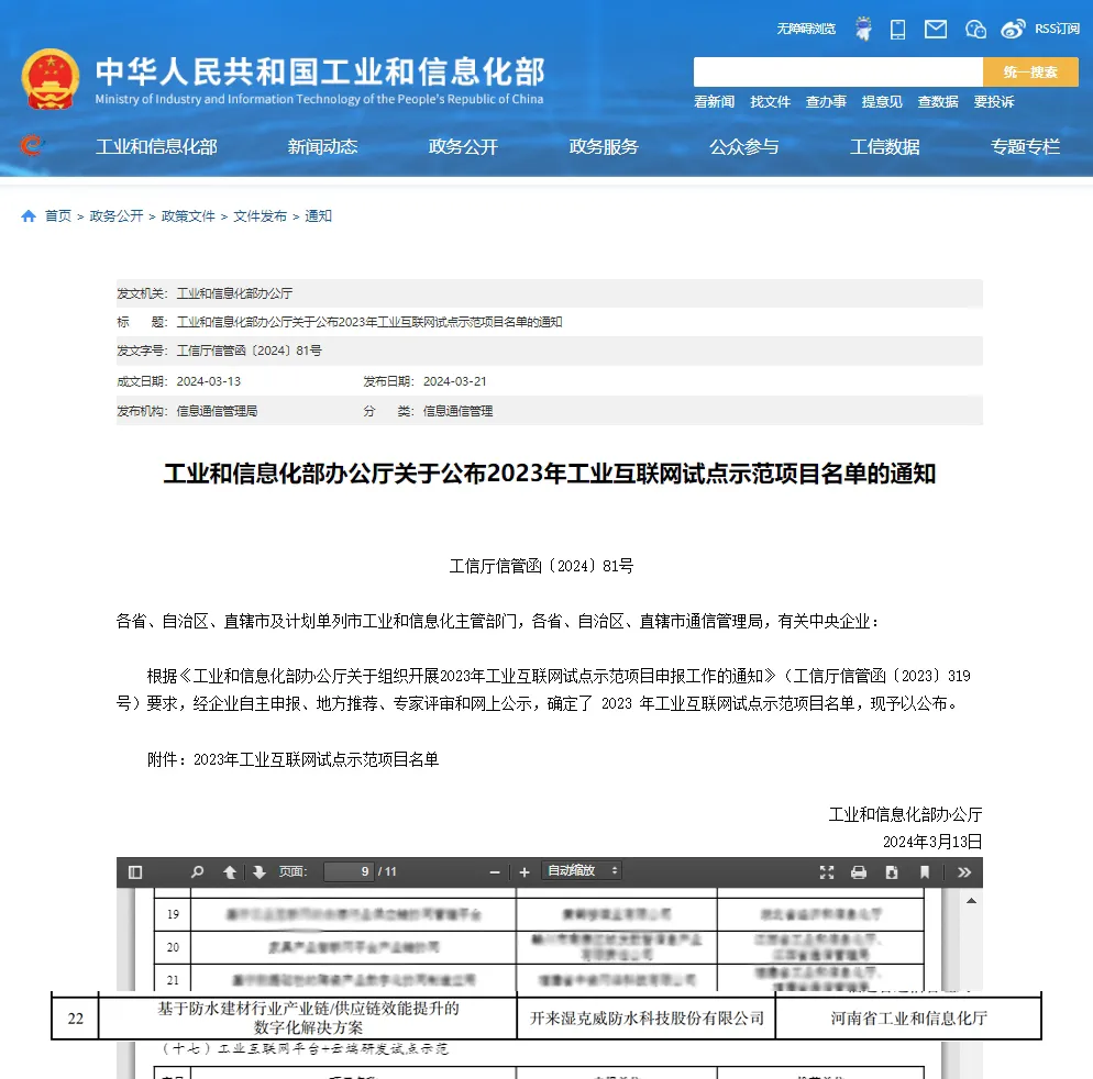 2024年3月13日,工业和信息化部发布的2023年工业互联网试点示范项目名单公示完毕,由一宁居+开来湿克威联合打造的“基于防水建材行业产业链/供应链效能提升的数字化解决方案”脱颖而出,成功入选工信部2023年工业互联网试点示范项目,此次获国家级认可,是对一宁居&开来湿克威在工业互联网平台建设和多年创新成果转化的充分肯定。