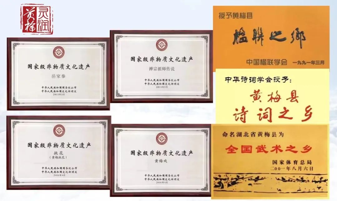 千年古刹五祖寺,是佛教禅宗发祥地,宋代被皇家赐为“天下祖庭”。全国六座禅宗祖庭,黄梅县独占两座,自古就有“蕲黄禅宗甲天下,佛教大事问黄梅”之说。拥有黄梅戏、黄梅挑花、佛教禅宗祖师、岳家拳等4张国家级非物质文化遗产名片,还是全国第一个“诗词之乡”、第二个“楹联之乡”,连续五届被国家文旅部命名为“中国民间文化艺术之乡”,是国家认定的“千年古县”。