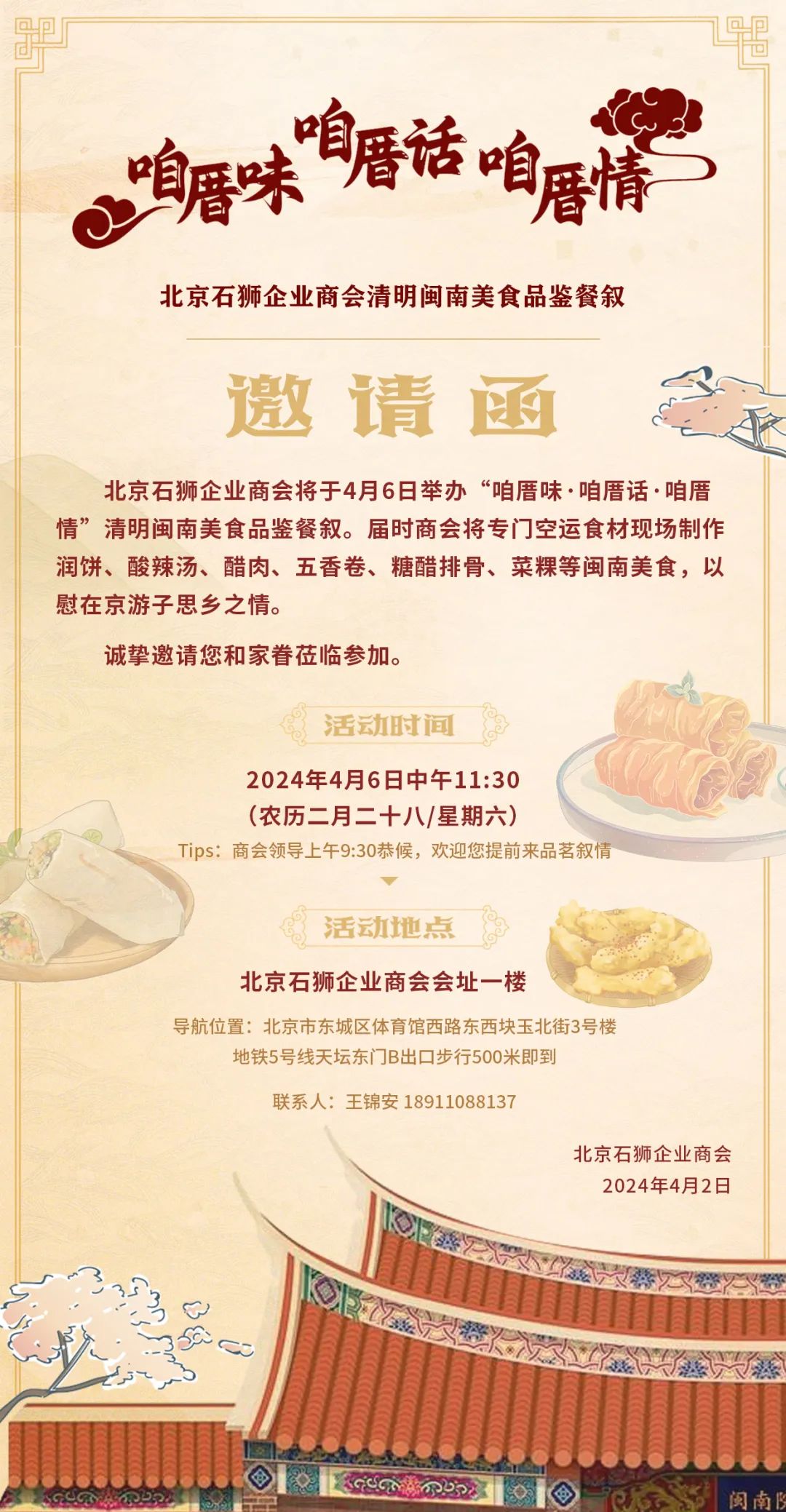 天坛悠悠玉兰开,最是清明思故乡。4月6日,北京石狮商会“咱厝味·咱厝话·咱厝情”清明闽南美食餐叙在京举办,邀请在京乡贤乡友齐聚一堂,共品乡味,同话乡音,常思乡情。