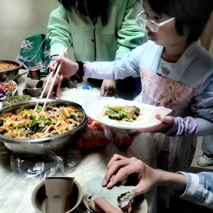 听说润饼该这样包,特定菜肴得铺成条,酥脆麻粩压实真甜,白糯饼皮要温柔卷,咱厝风俗跟着做,欢声笑语中人人有。