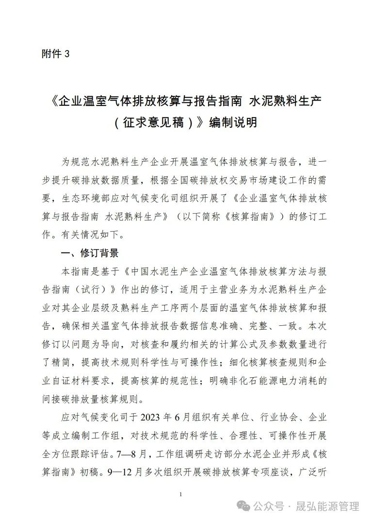 为加强企业温室气体排放管理,规范水泥行业企业温室气体排放核算报告与核查工作,做好扩大全国碳排放权交易市场行业覆盖范围的制度体系建设,根据《碳排放权交易管理暂行条例》,生态环境部组织编制了《企业温室气体排放核算与报告指南 水泥熟料生产》《企业温室气体排放核查技术指南 水泥熟料生产》,现公开征求意见(征求意见稿及其编制说明等材料可登录我部网站http://www.mee.gov.cn/ “意见征集”栏目检索查阅)。