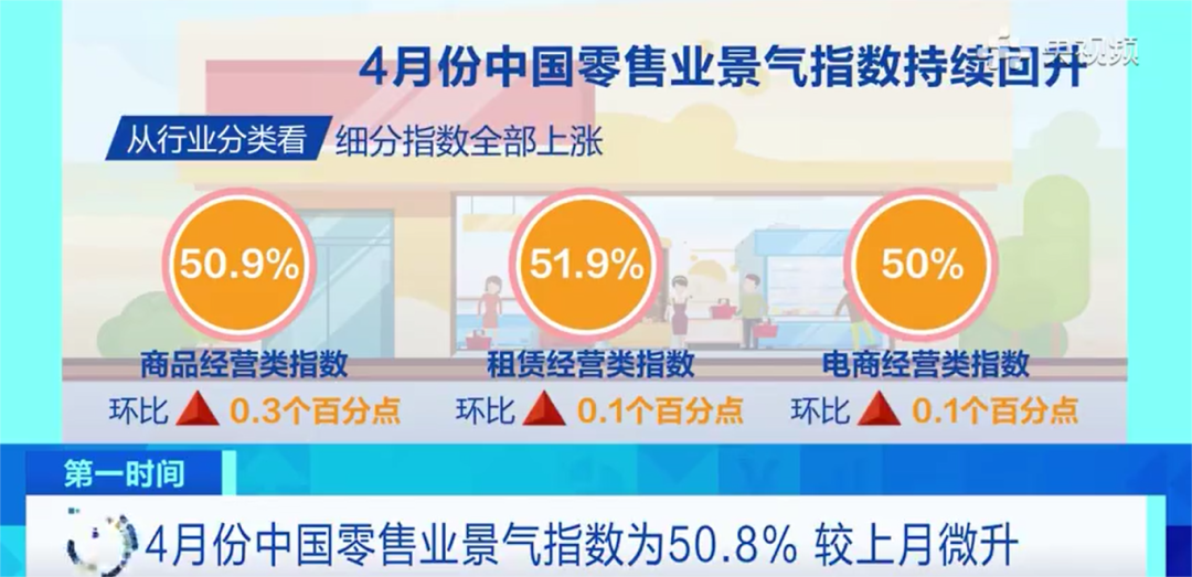 4月6日,中国商业联合会发布中国零售业景气指数。数据显示,4月份,中国零售业景气指数(CRPI)为50.4%,较上月微升0.3个百分点,连续一年维持在扩张区间。数据显示,CRPI三大分类指数同步上升,均在扩张区间运行,表明零售市场在春节假期消费淡季结束后,开始恢复平稳增长。从行业分类看,商品经营类指数为50.3%,较上月微升0.4个百分点;租赁经营类指数为50.2%,较上月微升0.1个百分点;电商经营类指数为50.8%,较上月微升0.1个百分点。