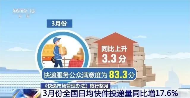 4月6日,国家邮政局快递大数据平台监测数据显示,3月份全国日均快件投递量为4.42亿件,同比增长17.6%,行业运行整体保持畅通稳定。据第三方社会机构调查结果显示,3月份快递服务公众满意度为83.3分,同比上升3.3分;快递服务全程时限均值为52.59小时,同比缩短1.51小时;72小时妥投率为85.00%,同比提升0.63个百分点;快递市场价格未出现明显波动。