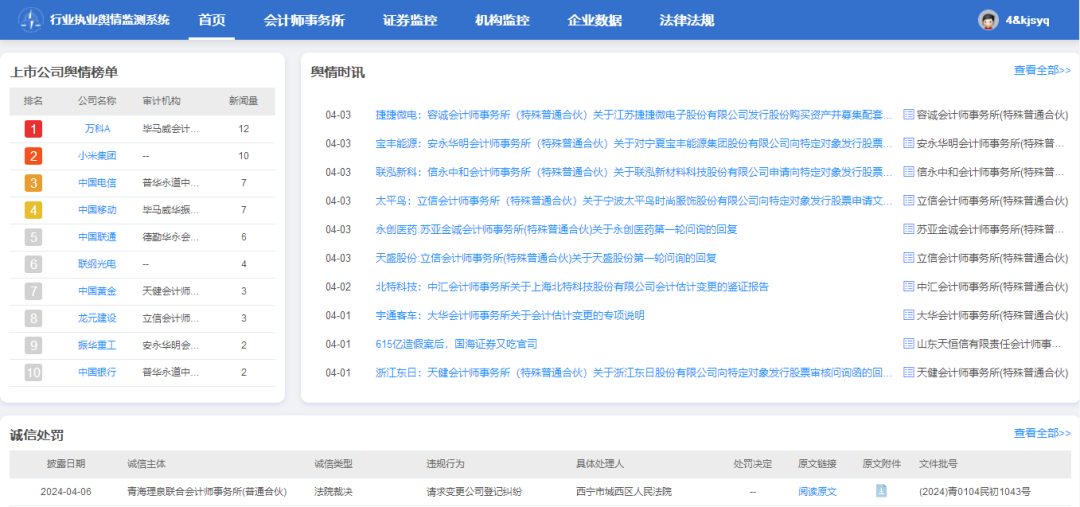 行业执业知识库通过汇集国内外主流媒体公开信息,建立会计师事务所和被审计企业工商变更、舆情事件、处罚信息、财务等多重关联信息,并提供企业库和法律法规库,通过大数据分析监测,有助于辅助性预警和风险识别