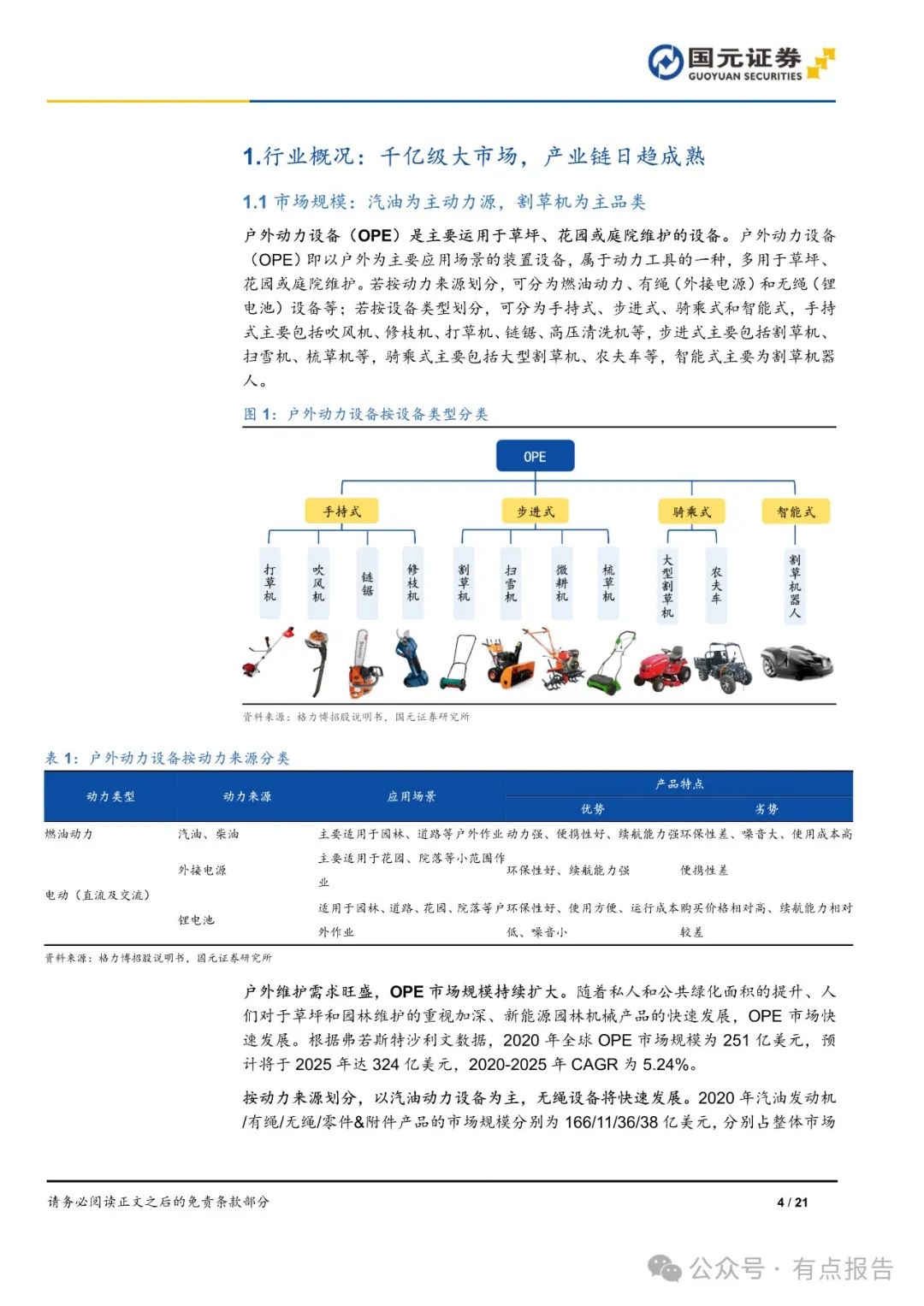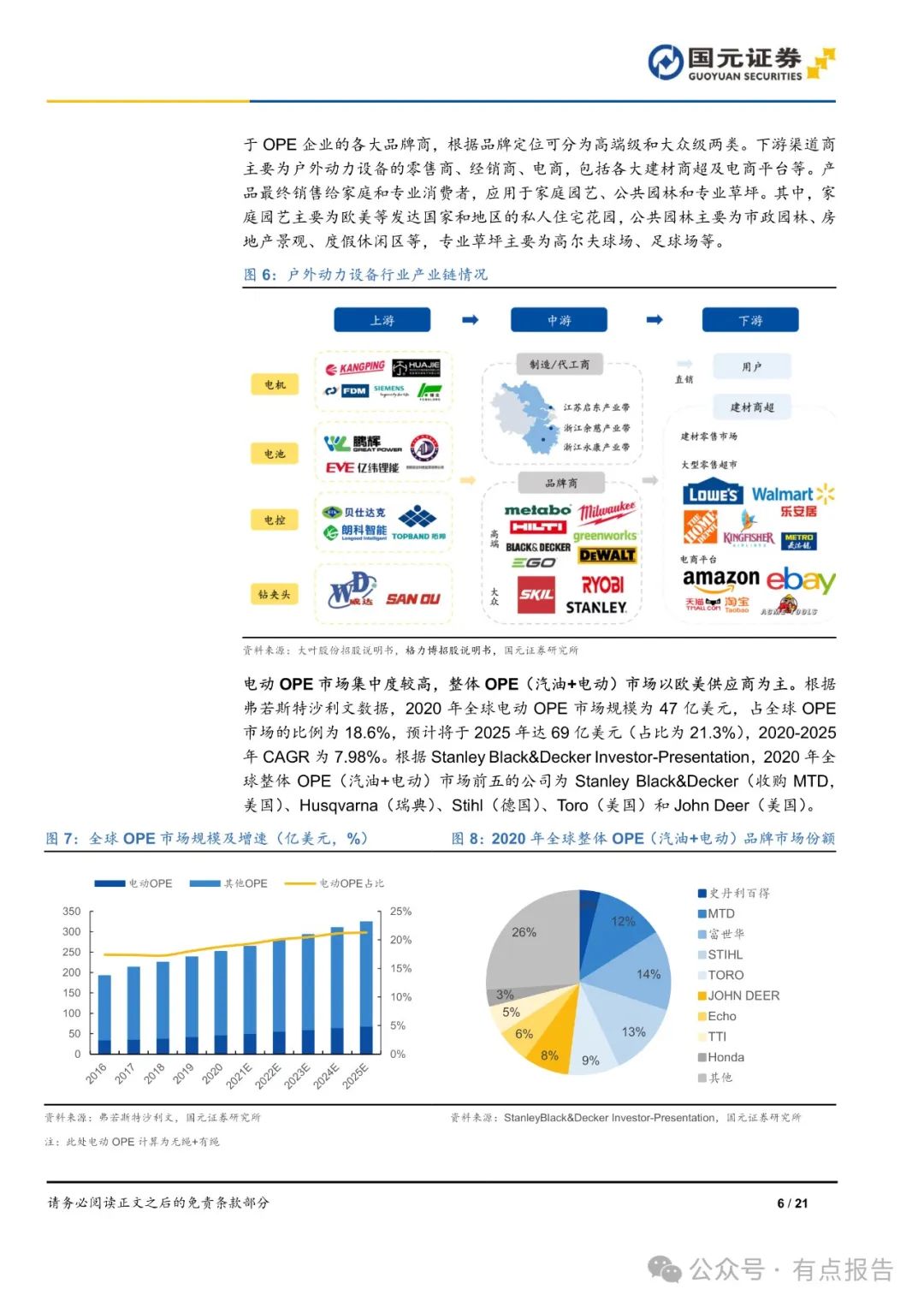 按动力来源划分,以汽油动力设备为主,无绳设备将快速发展,按设备类型划分,以割草机为主。户外动力设备产业链包括上游零部件供应商、中游工具制造/代工商及品牌商、下游建材商超。电动 OPE 市场集中度较高,整体 OPE(汽油+电动)市场以欧美供应商为主。