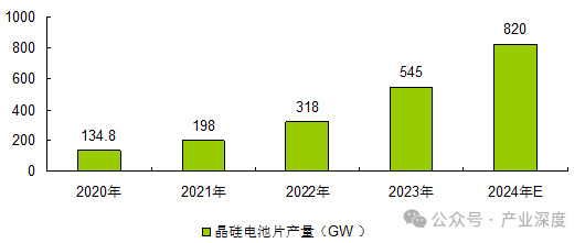 2023 年,全国晶硅电池片产量约为545GW,同比增长 64.9%。预计 2024 年全国电池片产量将超过 820GW。
