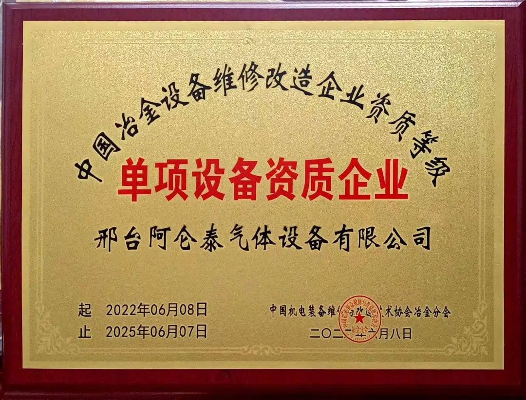 中国机电装备维修与改造技术协会治金分会专家评审组于2022年5月19日对邢台阿仑泰气体设备有限公司申请的中国冶金设备维修与改造企业资质进行了线上评审。通过资料审查、人员能力考核、现场场地、设备、设施、检测仪器、技术文件等资源核查,评审组认为该单位建立了较完整的质量管理体系且运行正常,相关人员职责明确并有效落实,人员能力满足检验需要,维修过程、文件及记录得到一定控制,能够按照规范开展所申请的维改项目等设备的维修、维护、改造。邢台阿仑泰气体设备有限公司制氧运维通过中国冶金设备维修与改造企业资质单项认定,获得单项设备资质企业证书。