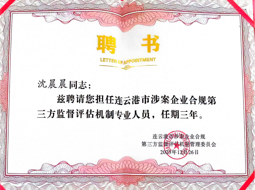 市涉案企业合规第三方机制管委会成员单位分管领导为专家代表颁发聘书。