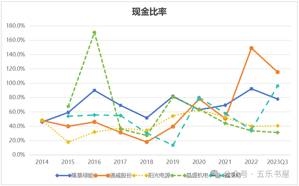 平均而言,隆基的数值最高,且非常稳定,从经营上来讲,隆基是做的真的好,极端情况下生存能力很强;通威由于近两年盈利大增,此数值也大幅提高;晶盛机电在2017年之前很高但后续波动向下;阳光电源和福莱特有些相似,均在50%左右波动。
