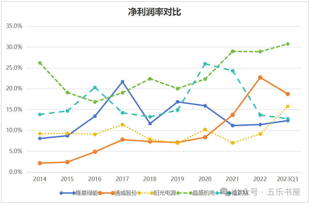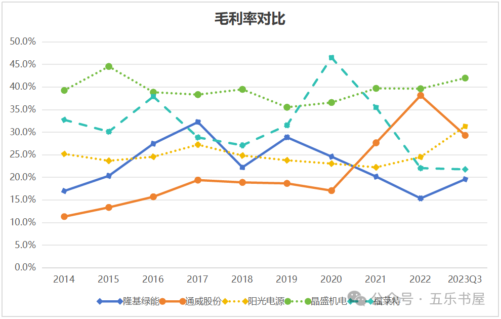毛利率代表了公司所提供的产品和服务的议价能力,是公司盈利能力的基础,毛利率高才有更多的可挖掘盈利空间。如上图所示,平均来看,晶盛机电最高,通威最低;从趋势上看,晶盛机电的波动性最小,阳光电源近两年趋势向上,通威2021、2022年毛利率非常高但2023年降了下来,隆基和福莱特近几年都在下降。